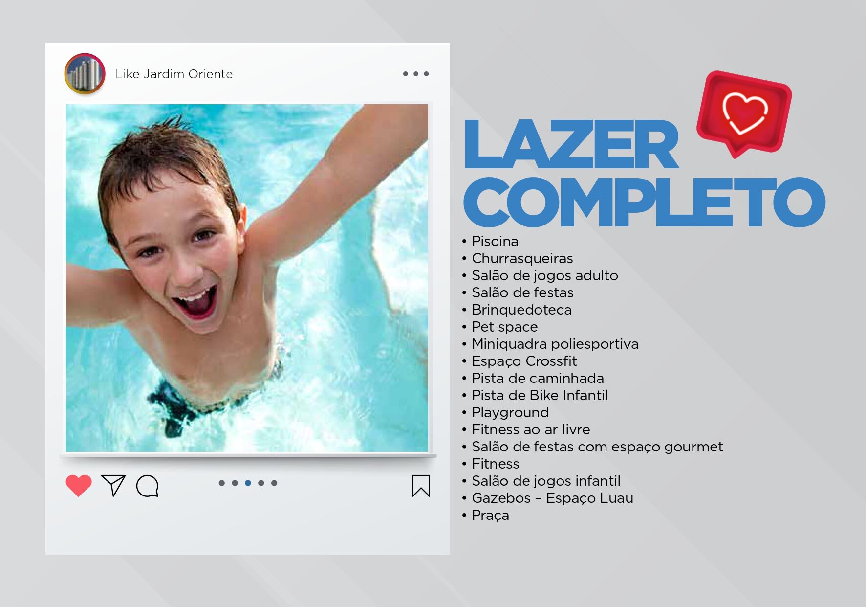 BicicletárioBrinquedotecaChurrasqueiraDuchaElevador socialEspaço crossfitEspaço fitnessEspaço gourmetGazeboPetplacePiscina adultoPiscina infantilPista de bike infantilPista de caminhadaPlaygroundPortariaPortão eletrônicoPraçaQuadra poliesportivaSalão de festasSalão de jogos adultoSalão de jogos infantilVagas de estacionamento